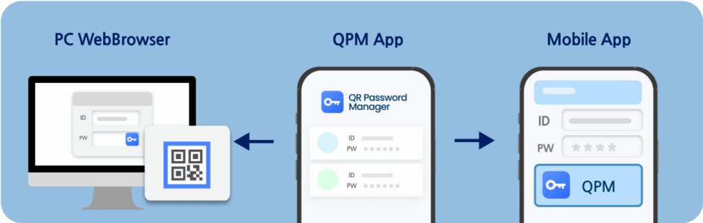 QR Password Manager (www.qrpasswordmanager.com) is a decentralized password manager that, unlike existing password managers that synchronize user IDs and passwords to a server, does not have a centralized synchronization server. All user IDs and passwords are encrypted and stored on the smartphone, and when login information is needed, they are automatically entered into another device through QR code-based communication.